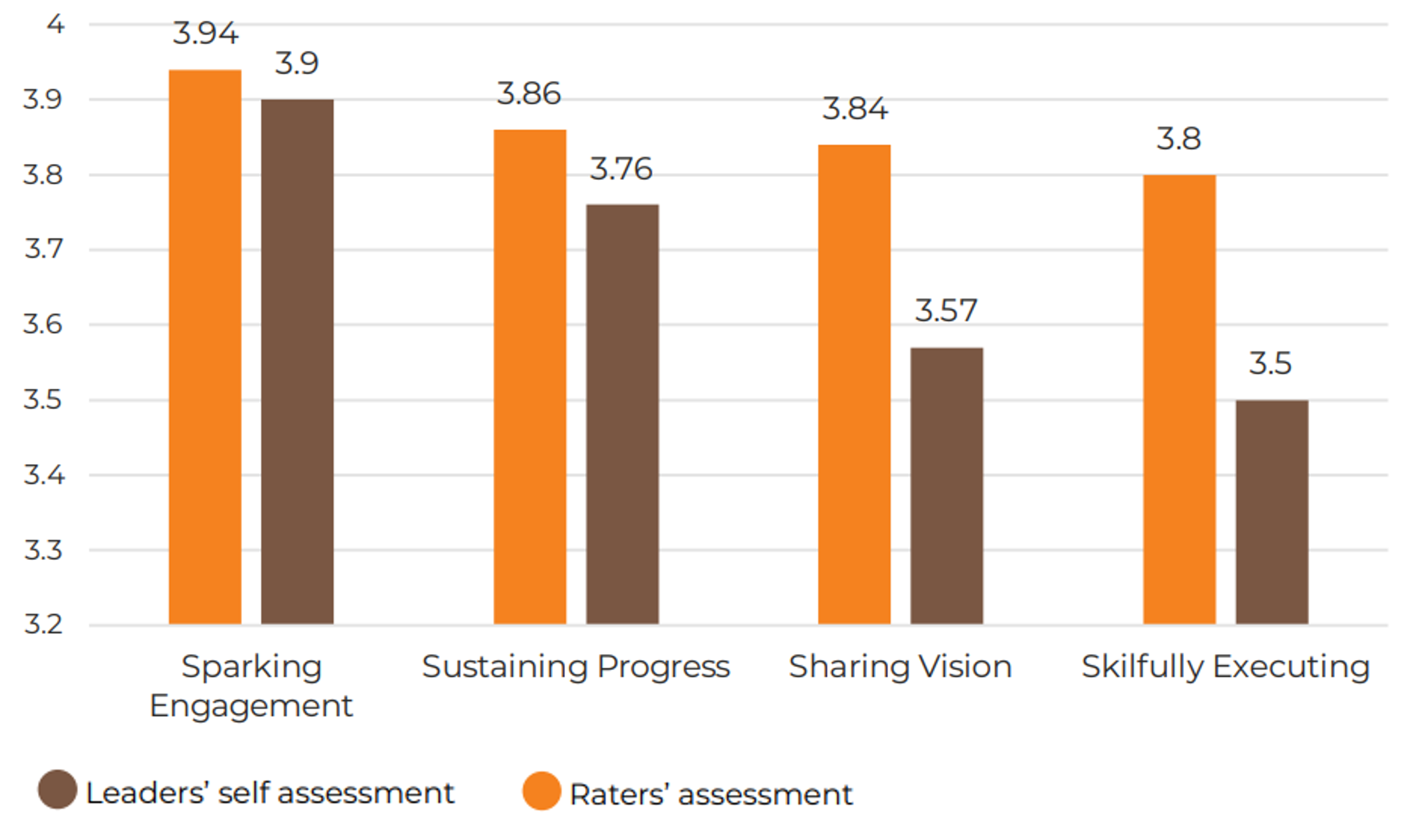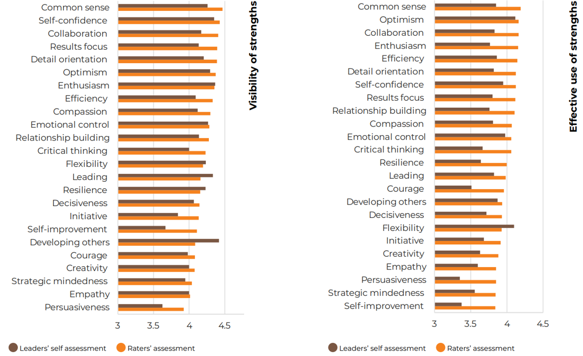 Overall, the leaders’ stakeholders rate the leaders’ visibility and effective use of strengths higher than the leaders rate themselves.
