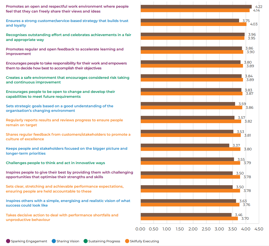Overall, leaders in operations score lowest on keeping people informed on the long-term aims and objectives, challenging people to think and act in innovative ways and celebrating success fairly. See the data from all the industries here.